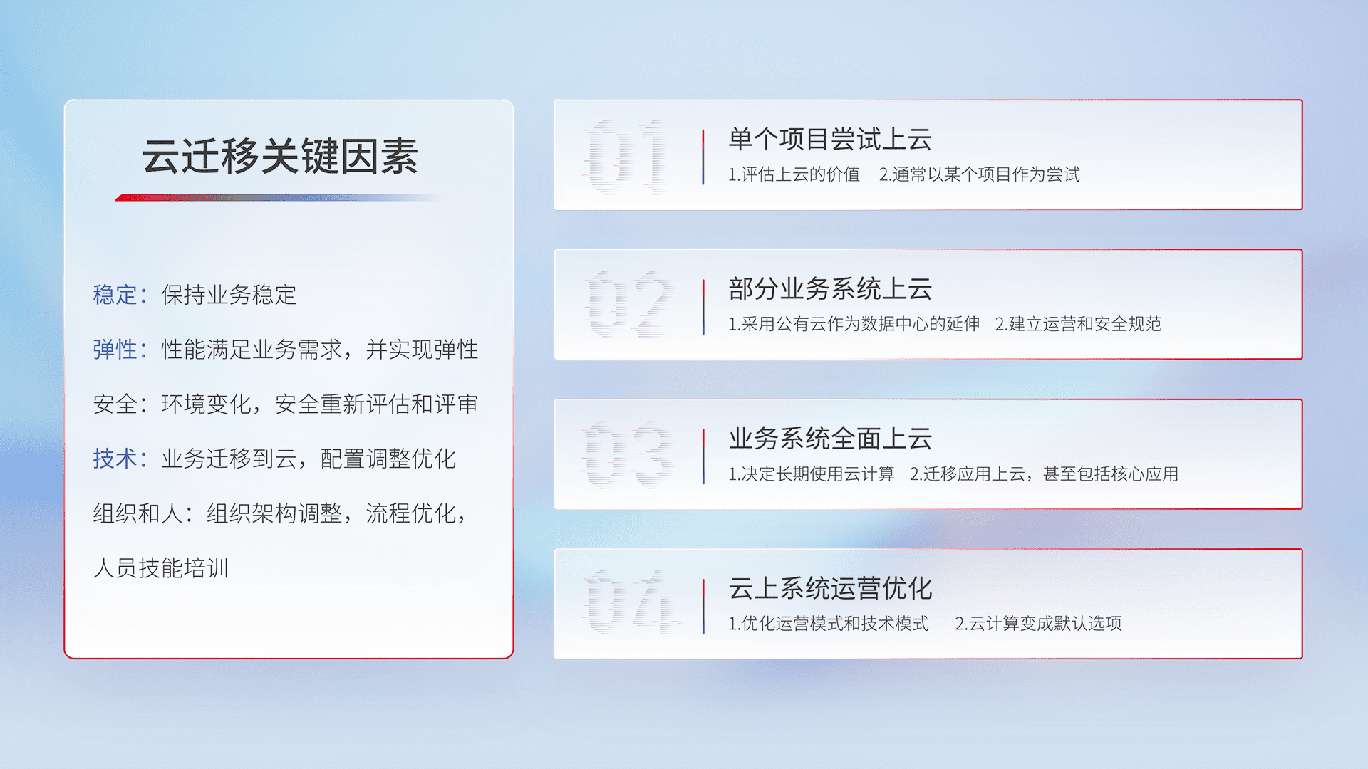 结合实际业务,,,从规划设计、、、、云平台选型、、、云原生改造、、、数据迁移、、、、集成交付,,,,迁移全过程为客户识别最佳上云路径,,,做好风险识别管理,,,设计网络架构、、身份权限、、、、安全审计合规、、、、操作审计、、、、日志审计、、监控告警策略、、、多站点容灾设计等,,对云上基础设施进行整体规划,,,,提升IT治理水平,,,以满足弹性、、高可用、、、高性能的需求。。。。